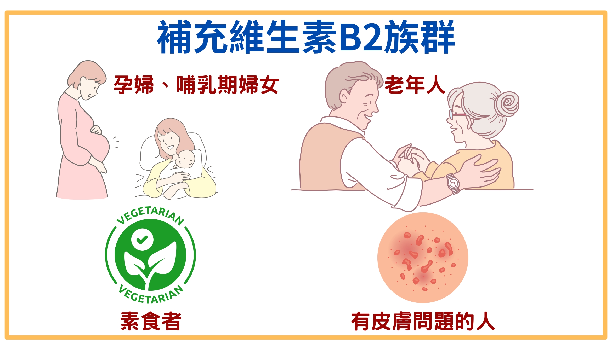 1. 孕婦與哺乳期婦女:孕婦和哺乳期婦女需要更多的維生素B2來支持胎兒或嬰兒的發育與母體的健康。維生素B2有助於能量代謝,並支持細胞生長和修復。