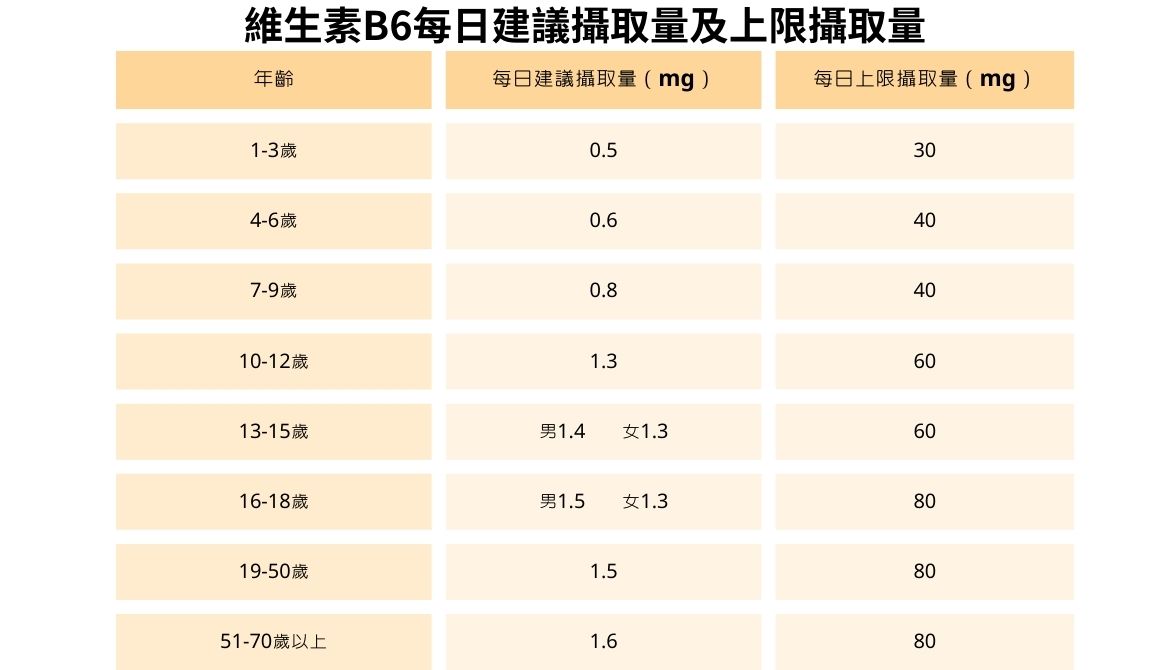 每日建議攝取量與攝取量上限,孕婦或是哺乳期婦女的話,需要額外增加0.4毫克的維生素B6。