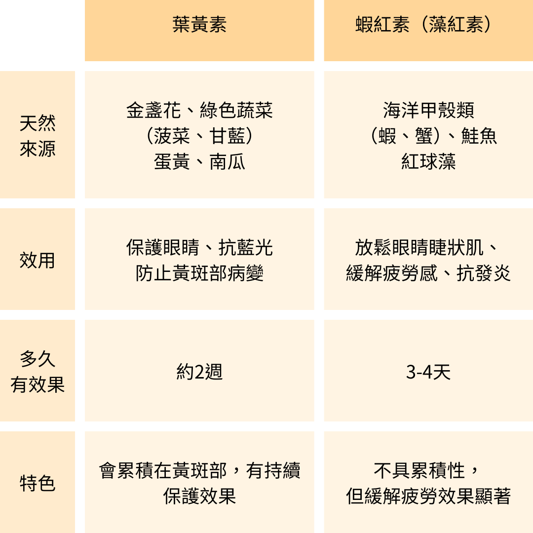 蝦紅素保護視網膜、幫助緩解眼睛疲勞,而葉黃素降低眼睛是網膜對的光傷害。
