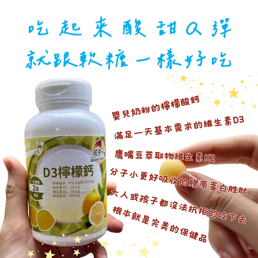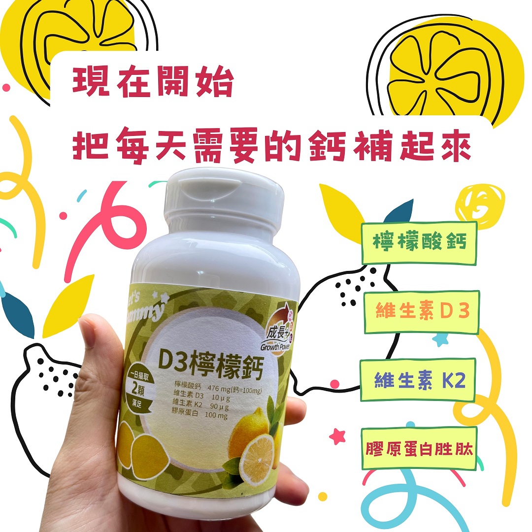 主成分:檸檬酸鈣 476mg、維他命D3 400IU、維他命K2 90ug、膠原蛋白胜肽 100mg